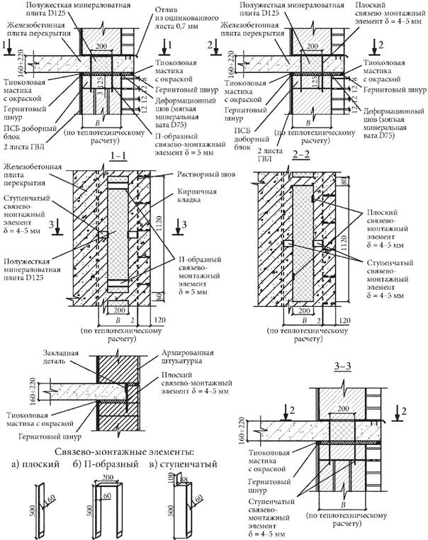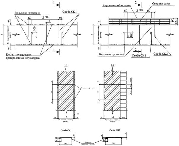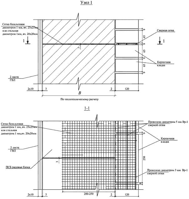 3.20 связевые элементы: Детали из проволоки или штукатурных сеток (стальных, базальтовых), укладываемые в горизонтальные швы кладок из полистиролбетонных блоков и перемычек с выпусками в совпадающие швы кирпичной кладки или в штукатурку, обеспечивающие в наружных стенах надежную совместную работу облицовочных слоев и теплоизолирующего слоя из полистиролбетонных изделий.