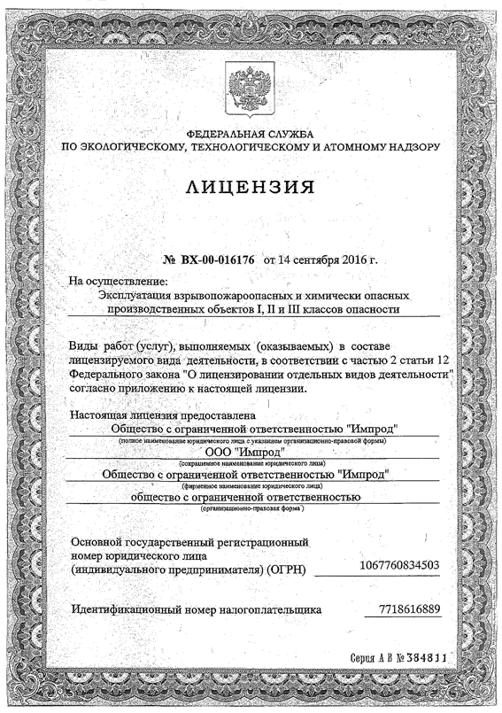 Вопрос: Общество с ограниченной ответственностью "Импрод" (далее - Заявитель) на основании лицензии от 14.09.2016 № ВХ-00-01676 осуществляет эксплуатацию взрывопожароопасных и химически опасных производственных объектов I, II, III классов опасности по адресу: Владимирская область, Собинский район, г. Лакинск, ул. Мира, д. 49-д.