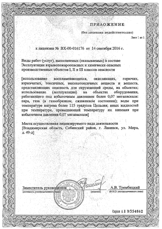 После завершения реорганизации правопреемник Заявителя будет осуществлять все те виды деятельности, который осуществлял ранее Заявитель, в том числе эксплуатировать взрывопожароопасные и химически опасные производственные объекты I, II, III классов опасности по адресу: Владимирская область, Собинский район, г. Лакинск, ул. Мира, д. 49-д.