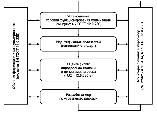 4.1 Организация в рамках системы управления охраной труда и риск-ориентированного подхода, являющегося основополагающим моментом обеспечения безопасности труда, должна обеспечить выполнение процесса, состоящего из неразрывно связанной последовательности процедур: «идентификация опасностей» - «оценка риска: определение степени риска и допустимости риска» - «разработка мер по управлению рисками».