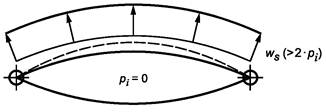 П.2 Давление ветра заставляет верхний слой ЭТФЭ-подушки прогибаться внутрь до тех пор, пока не будет достигнуто равновесие давления ветра и внутреннего давления. Как только предварительное натяжение верхнего слоя будет компенсировано, внутреннее давление становится равным давлению ветра. Далее нижний слой испытывает на себе давление ветра и прогибается, а верхний слой полностью провисает (см. рисунок П.2).