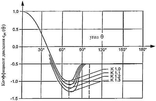 В зависимости от значения hR/aR выбирают соответствующую кривую распределения коэффициентов ребристости поверхности К 1.0 - К 1.3 (таблица Д.1), а затем по рисунку Д.1 находят коэффициент внешнего давления сре (θ).