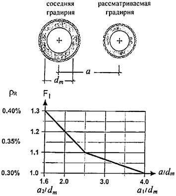 Для отдельно стоящей градирни влияние расположения другой градирни на расстоянии а (рисунок Д.3) учитывается коэффициентом помех F1, %, и, при необходимости, увеличением значения минимального армирования ρR для кольцевой арматуры в нижней части оболочки