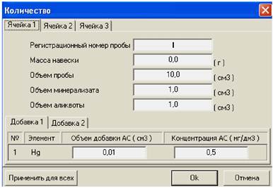 ячейки указывают: массу навески, объем пробы и концентрацию добавки.