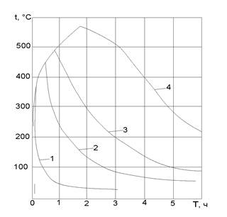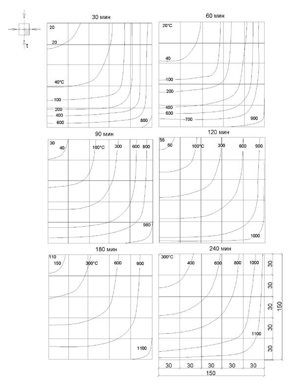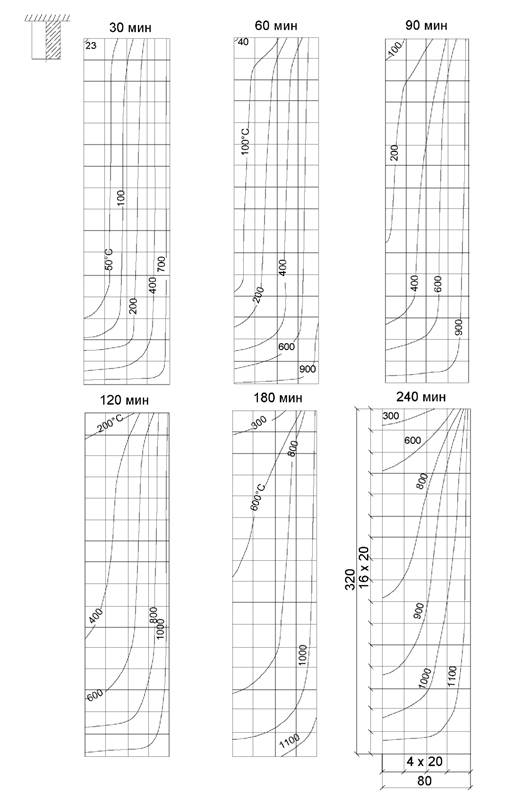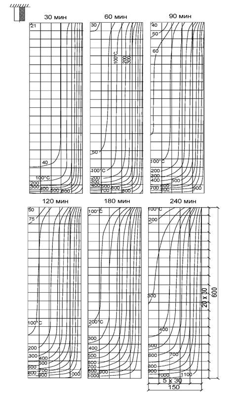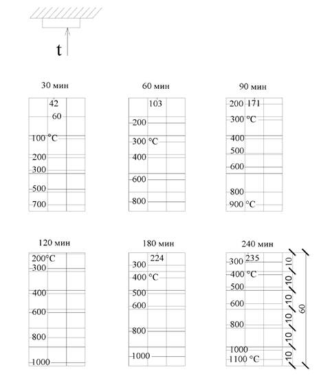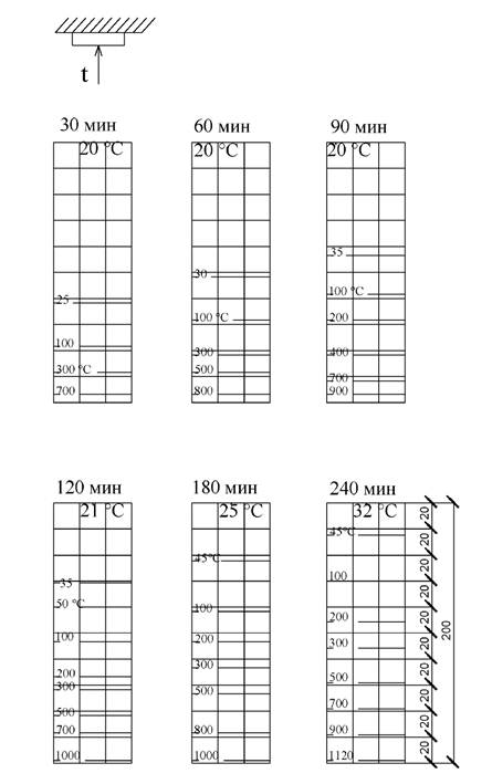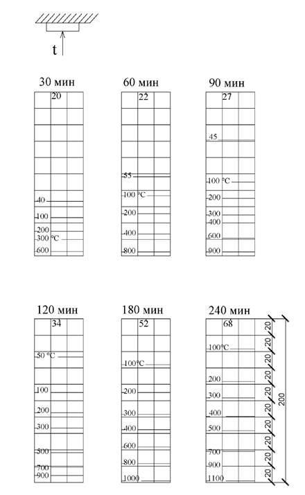 Графики распределения температур в поперечных сечениях железобетонных конструкций при пожаре