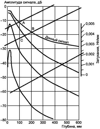 Данный способ определения коэффициента затухания следует использовать для изделий сложной формы, когда получить второй донный сигнал невозможно. Суть этого способа состоит в следующем. По системе «АРД-универсал» строят АРД-диаграммы для донной поверхности для заданных дискретных значений коэффициента затухания. Затем экспериментально определяют амплитуды донных эхо-сигналов в изделии или настроечном образце. При этом если экспериментальные точки укладываются на АРД-кривую, имеющую соответствующее значение коэффициента затухания с разбросом не более ±1,5 дБ, то это значение на АРД-кривой считают искомым.