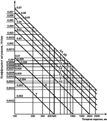 Пример - Величина A2 - A1 = 14 дБ. Толщина изделия r = 500 мм. Построение, показанное толстыми линиями, дает δ = 0,0009 Нп/мм (0,008 дБ/мм).