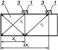 А.3.2 Если не имеется возможности получить отражение от двугранного угла, как, например, при УЗК роторов, то определение коэффициента затухания производят в соответствии с тем, как показано на рисунке А.4. Необходимо использовать ПЭП с углом ввода 45°. Дефектоскоп следует включить по раздельной схеме. Излучатель и приемник следует расположить на расстоянии r1, а затем увеличить его до расстояния r2 = r1. Затем необходимо определить соответствующие амплитуды сигналов A1 и A2 и найти разность A2 - A1 = ΔA, дБ, коэффициент затухания по номограмме, приведенной на рисунке А.2, и полученный результат умножить на 2, так как это определение коэффициента затухания выполнено по методу прохождения, а номограмма построена для эхо-метода.