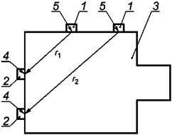 1 - излучатель; 2 - приемник; 3 - ОК; 4, 5 - точки ввода