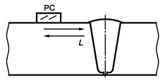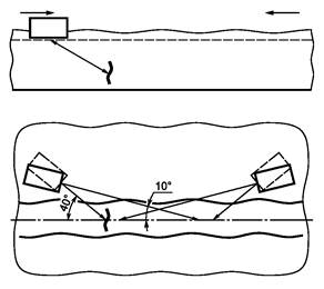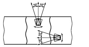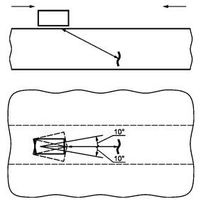 9.2.10 Сканирование наклонными преобразователями и ПЭП головных волн вдоль продольной оси СС проводят возвратно-поступательным движением, перемещая ПЭП по снятому валику усиления с перекрытием на расстояние околошовной зоны (см. рисунок 12а). Одновременно с возвратно-поступательным движением ПЭП его поворачивают на ± 10° относительно собственной оси.
