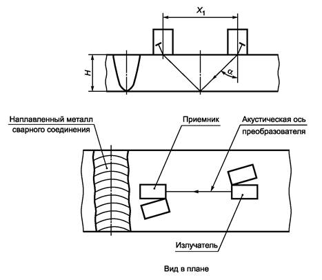 А.1.3.4 Перемещая один из ПЭП, находят максимальную амплитуду эхо-сигнала и замеряют расстояние между точками выхода луча X1.