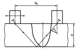 А.1.3.6 Перемещая один из ПЭП, находят максимальную амплитуду эхо-сигнала и замеряют расстояние между точками выхода луча X2.