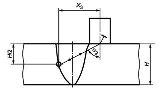 А.1.3.8 Для определения угла ввода с одной стороны АСС необходимо найти максимальную амплитуду эхо-сигнала от БЦО, расположенного на глубине H/2 по линии сплавления, при этом УЗ-волна проходит через наплавленный металл АСС (см. рисунок А.4).