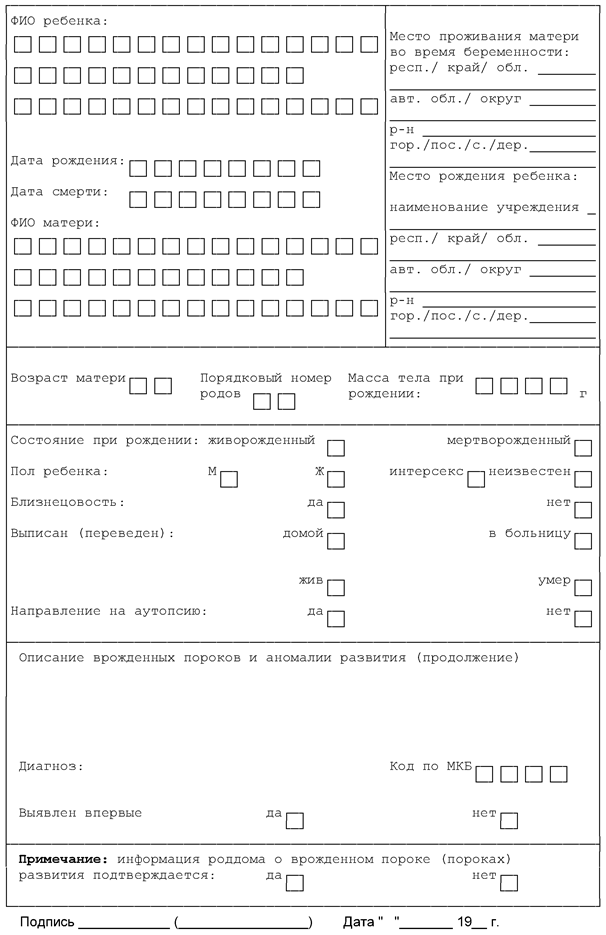 - в родильном доме (отделении) на каждого новорожденного (живо- и мертворожденного) ребенка с врожденным пороком (пороками) развития при выписке ребенка из родильного дома (отделения) с обязательной отметкой в "обменной карте" новорожденного;
