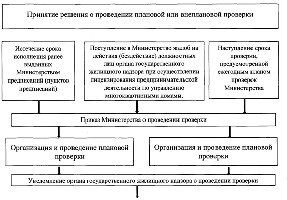 Блок-схема исполнения Министерством строительства и жилищно-коммунального хозяйства Российской Федерации государственной функции по осуществлению контроля за соблюдением органами исполнительной власти субъектов Российской Федерации, осуществляющими региональный государственный жилищный надзор, требований к лицензированию предпринимательской деятельности по управлению многоквартирными домами