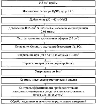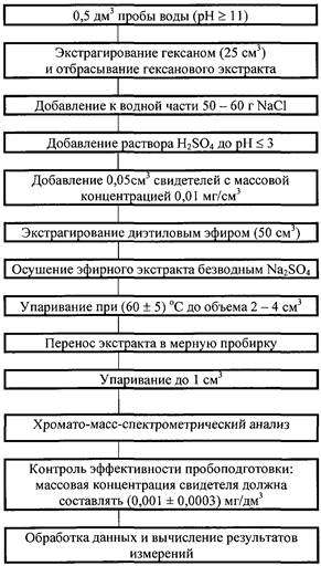 Перед приготовлением образцов проводят анализ «холостой пробы»: 0,5 дм3 пробы воды, которую планируют использовать для приготовления образцов, подвергают процедуре подготовки пробы по методике и выполняют измерения. По полученной масс-хроматограмме рассчитывают фоновое значение массовой концентрации определяемого вещества. Полученное значение не должно превышать 30 % нижнего предела определения вещества. При невыполнении данного условия для приготовления образцов отбирают и проверяют другую пробу воды.