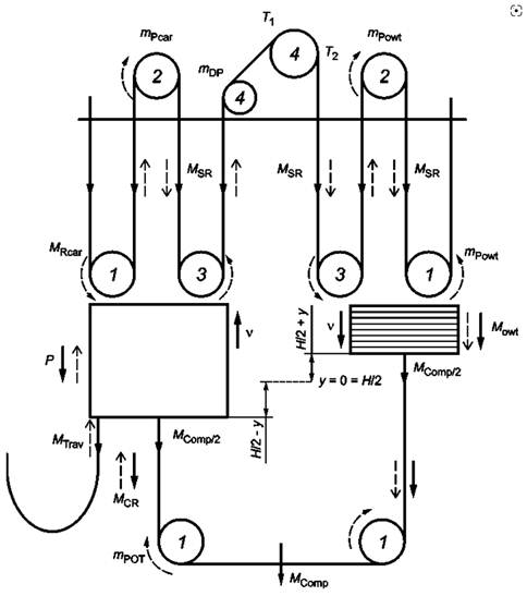 1 - кабина; 2 - противовес; 3 - шкив и блоки; 4 - подвесной кабель; 5 - несущие канаты Рисунок В.1 - Полиспастная подвеска 2:1, без компенсирующих элементов |