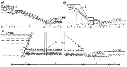 туннельный водосброс; в) - трубчатый водосброс