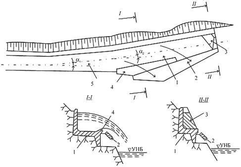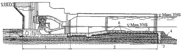 4 - отводящий участок; 5 - участок строительного водосброса; 6 - пробка