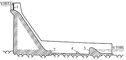2 - донные водосбросы 1 яруса; 3 - донные водосбросы II яруса; 4 -