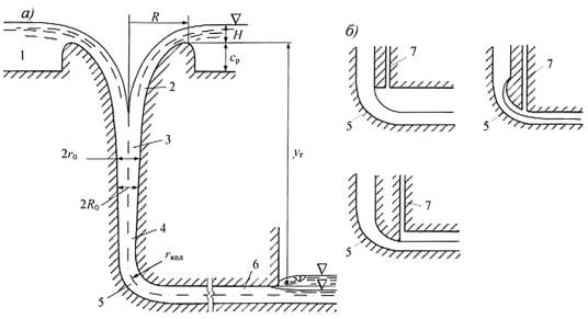 3.29 вихревой водосброс: Водосброс, на тракте которого с помощью специальных устройств создается закрутка потока, способствующая снижению кавитационной опасности и интенсификации гашения его кинетической энергии.