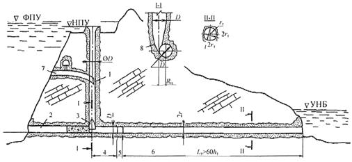 под грунтовой плотиной; 1 - строительно-эксплуатационный водосброс; 2 - входная