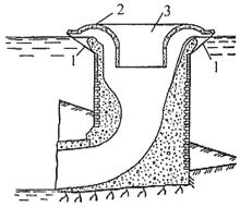 1 - бетон I очереди; 2 - бетон II очереди, уложенный под защитой затворов; 3 - затворы (шандоры)