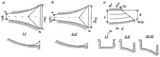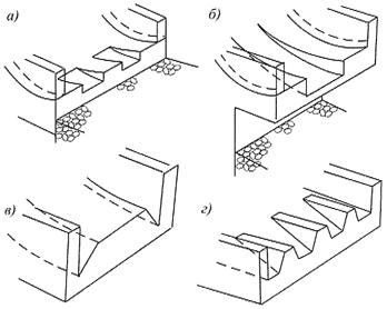 а - с забральной стенкой; б - с водосливным порогом; в - в виде водослива без порога