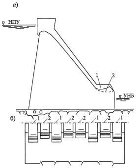 и отсасывающую трубу; в) - через донные водосбросы совмещенной ГЭС