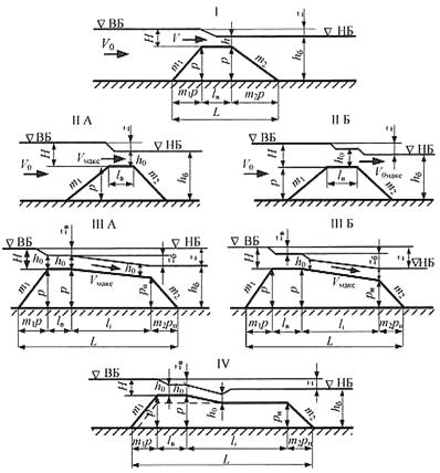 Пропускную способность переливных секций следует определять, относя их к тому или иному типу водосливов в зависимости от ширины гребня, высоты и очертания верховой и низовой граней.