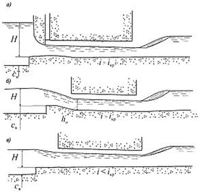 12.19 При проектировании безнапорных строительных туннелей в зависимости от условий затопления входа и уклона дна следует применять конструкции туннелей, приведенные на рисунке 55. Их пропускная способность должна быть рассчитана, исходя из схем истечения как отверстия (рисунок 55 а), водослива практического профиля (рисунок 55 б) и водослива с широким порогом (рисунок 55 в). При этом в последнем случае необходимо учитывать возможность подтопления входного участка со стороны нижнего бьефа.