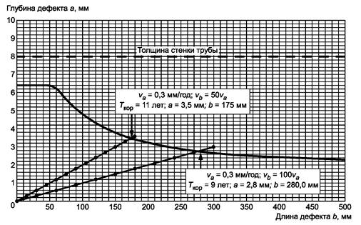 Примечание - В расчете использовано значение плотности коррозионного тока iкор = Iкоp/S= 27/1,33 = 20,4 μА/см2 для изготовленного из хромоникелевой стали круглого образца площадью S = 1,33 см2 при коррозионном токе Iкор = 27 рА, соответствующем потенциалу коррозии Екор = 300 мВ. Эти параметры использованы только для демонстрации последовательности расчета в приведенном методическом примере. Реальные значения Iкор, Екор и iкор для образцов из стали 17Г1С, определяемые экспериментально, могут несколько отличаться от использованных для данного примера значений.