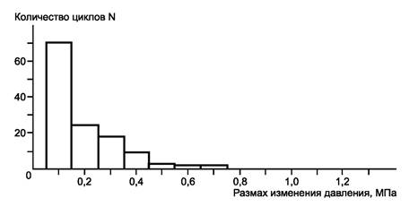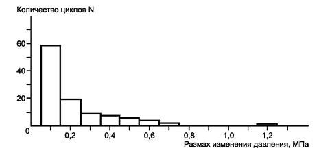 Изображенные на рисунках Л.2 и Л.3 гистограммы иллюстрируют распределения циклов с определенными размахами изменения давления, выделенными по методу полных циклов размахов в соответствии с ГОСТ 25.101. Эти схематизированные данные могут быть использованы в прогнозных расчетах показателей долговечности расчетных участков ЛЧМГ.