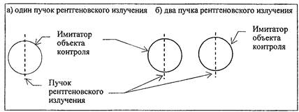 3.1.1. Измерение мощности амбиентного эквивалента дозы рентгеновского излучения на рабочих местах операторов РУДБТ 1-го типа проводят на 4 высотах (30, 80, 120, 160 см от пола) при максимальных рабочих значениях анодного напряжения и анодного тока рентгеновской трубки. В пучок излучения устанавливают имитатор объекта контроля в виде пластиковой емкости объемом не менее 5 литров, заполненной водой. Имитатор располагают таким образом, чтобы пучок рентгеновского излучения проходил через его центр. Для РУДБТ, использующих несколько пучков рентгеновского излучения, имитаторы объектов контроля устанавливают в каждый пучок (рис. 1).