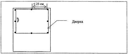 3.4.2. Выделяют точки измерения для каждой стенки защитного шкафа так же как и при проведении радиационного контроля РУДБТ 1-го типа (п. 3.2.3). Дополнительно выделяют точки измерения вдоль линии прилегания дверки к защитному шкафу с шагом не более 25 см (рис. 5) и точки, в которых при проведении сканирования обнаружены локальные максимумы.