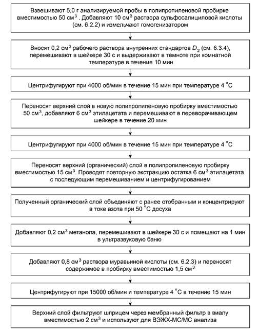 Метод основан на экстракции метаболитов карбадокса и олаквиндокса раствором сульфосалициловой кислоты, переэкстракции в этилацетат, концентрировании и перерастворении полученного экстракта, с последующим их количественным определением методом ВЭЖХ-МС/МС в режиме мониторинга множественных реакций (MRM). Количественное определение остаточного содержания метаболитов карбадокса и олаквиндокса (аналитов) проводят методом внутреннего стандарта.