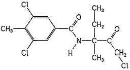 Название действующего вещества по ИЮПАК: (RS)-3,5-дихлор-N-(3-хлор-1-этил-1-метил-2-оксопропил)-п-толуамид.