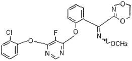 Название вещества по ИЮПАК: (1Е)-{2-[6-(2-хлорфенокси)-5-фторпиримидин-4-илокси]фенил}(5,6-дигидро-1,4,2-диоксазин-3-ил)метанон О-метилоксим.