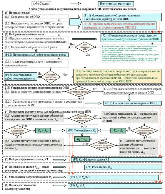 7. Процедуру установления допустимого риска аварии (схема представлена в приложении № 2 к настоящему Руководству) рекомендуется проводить для обоснования достаточности принятых мер, компенсирующих отступления от требований ФНП, в соответствии с требованиями пункта 11 Федеральных норм и правил в области промышленной безопасности «Общие требования к обоснованию безопасности опасного производственного объекта», утвержденных приказом Ростехнадзора от 15 июля 2013 г. № 306, и рекомендациями пункта 14 Руководства по безопасности «Методические рекомендации по разработке обоснования безопасности опасных производственных объектов нефтегазового комплекса», утвержденного приказом Ростехнадзора от 30 сентября 2015 г. № 387.