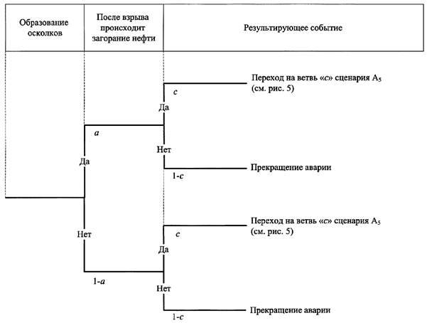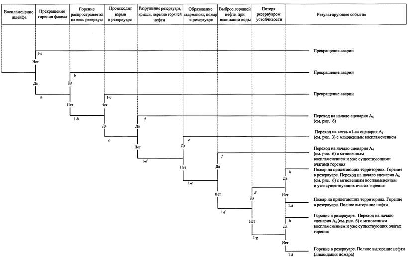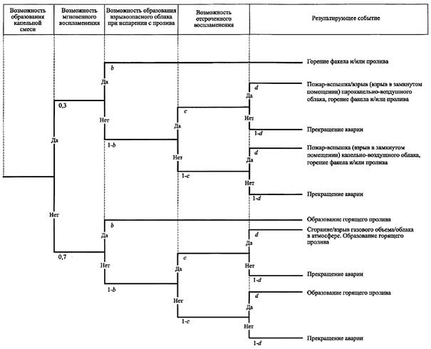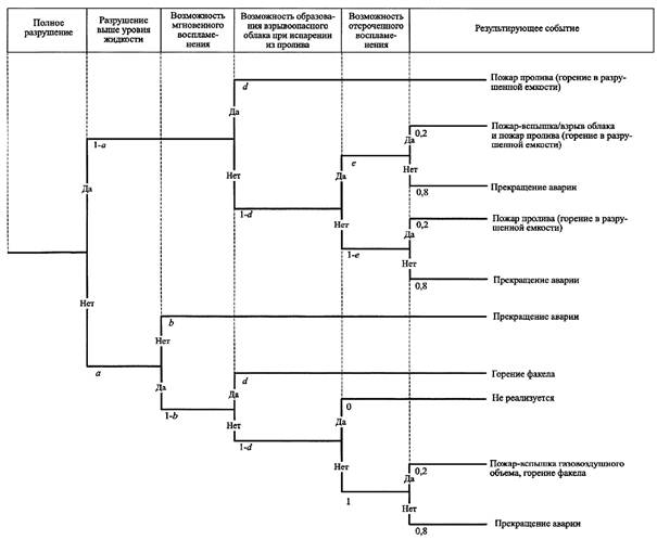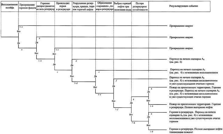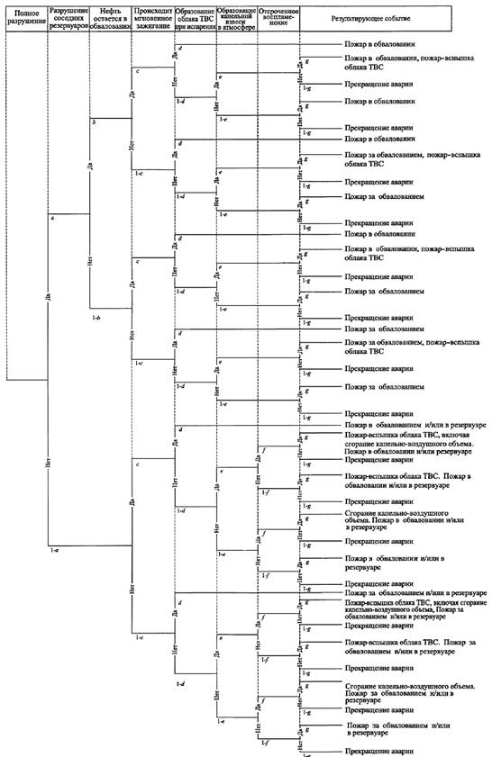 Каждый узел (разветвление) дерева событий отражает влияние факторов развития аварий. Общее число конечных ветвей дерева событий соответствует общему числу расчетных сценариев аварии, образующих полную группу несовместных событий (см. пример в приложении № 5 к настоящему Руководству).