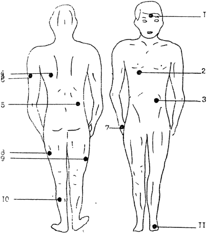 - датчики для измерения температуры кожи и теплового потока располагаются на поверхности тела человека в соответствии со схемой, представленной на рис. 1;