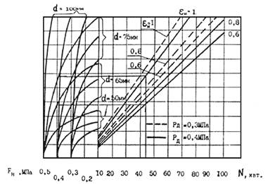 По номограмме (рис. 6.2) находим диаметр гибкого воздухопровода: при εн = 0,6, d = 65 мм, при εн = 1, d = 75 мм.