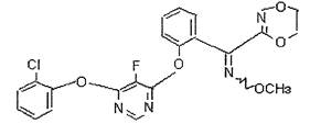 Название вещества по ИЮПАК: (1Е)-{2-[6-(2-хлорфенокси)-5-фторпиримидин-4-илокси]фенил}(5,6-дигидро-1,4,2-диоксазин-3-ил)метанон О-метилоксим.