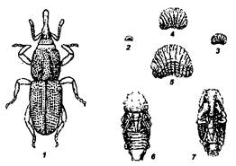 1 - жук (вид сбоку), 2 - личинка в зерне, 3 - куколка