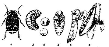 5 - ходы личинки в створке боба, 6 - боб с поврежденными горошинами