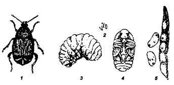 1 - жук, 2 - яйца, 3 - личинка, 4 - куколка,