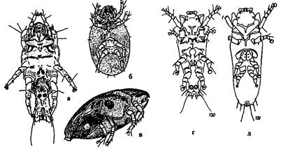 д - сем. Trichodectidae (Bovicola equi) (по Благовещенскому, 1959).