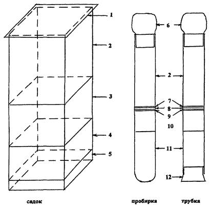 4 - слой перегноя, 2 - 3 см; 5 - слой песка, 1,0 - 1,5 см; 6 - ватно-марлевая