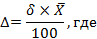 δ - граница относительной погрешности методики (показатель точности в соответствии с диапазоном концентраций, табл. 1), %.