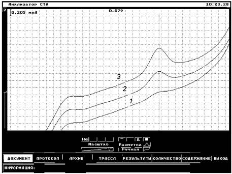 вольтамперограмм пробы с добавкой». Снимают по 3 - 5 вольтамперограмм.